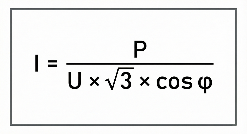 Here the formula is more complex: I = P / (U × √3 × cos φ).