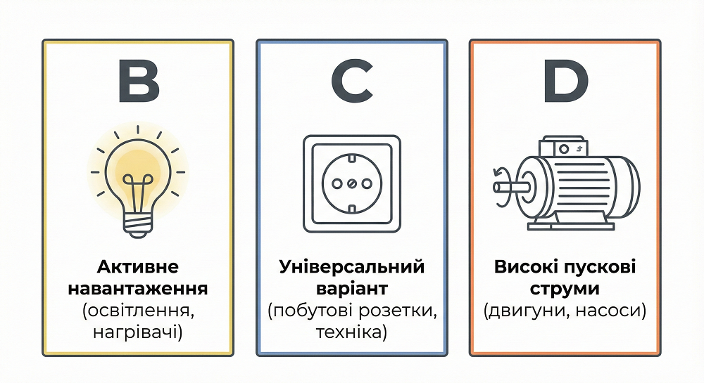 - C: universal option for household outlets and mixed loads (computer, refrigerator, washing machine). This is the most common type in residential buildings.